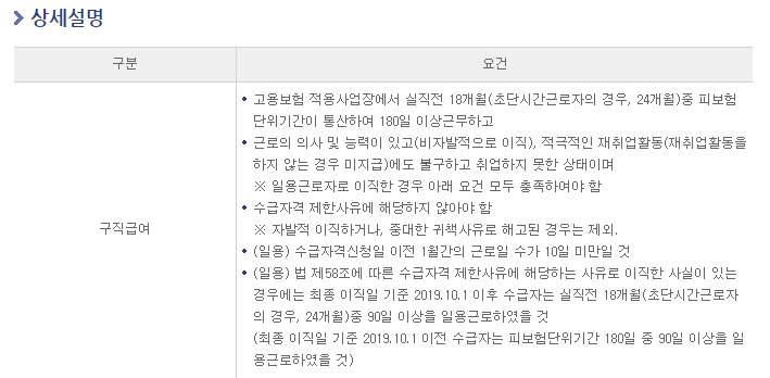 구직급여의 조건은 고용보험 적용사업장, 즉 학교에서 피보험단위기간이 180일 이상 근무하고, 비자발적으로 퇴사항 경우이다. 즉 기간제 교사의 경우 6개월 이상~근무를 해야 180일이 채워진다. 1년 이상의 계약기간의 기간제교사의 경우에는 당연히 계약 기간 만료가 비자발적인 퇴사이기때문에 실업급여 신청 조건에 충족한다. 하지만 6개월 단위의 기간제 계약일 경우 통상적으로 3월 1일 ~ 8월 31일 계약인 경우인데 이는 실제 일자수로 따졌을 때 약간의 문제가 초래될 수 있다. 주말, 토요일, 공휴일, 재량휴업일 등을 근무일수에 포함할 것인가 아닌가의 문제가 발생한다.